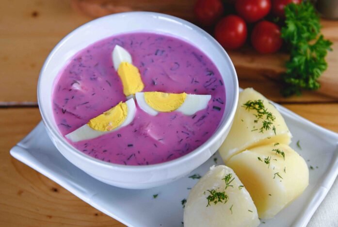 Pink beet soup served cold with cucumber, dill, and egg, offering a fresh and bright taste that makes this classic Lithuanian dish a favorite.