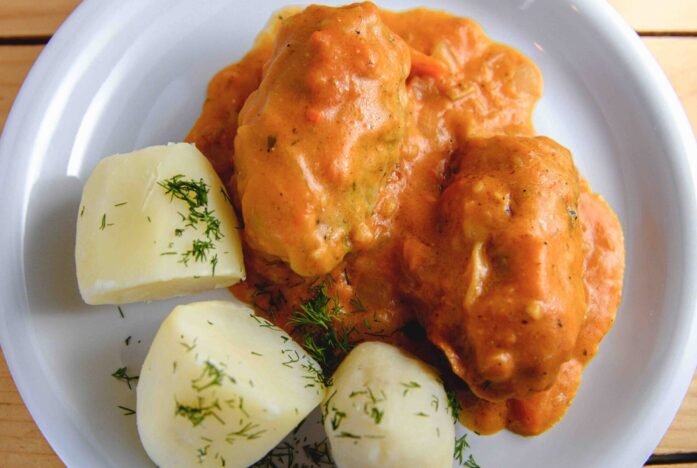 Cabbage rolls filled with rice and meat, simmered slowly in tomato sauce for a warm dish that brings classic Lithuanian comfort to your table.